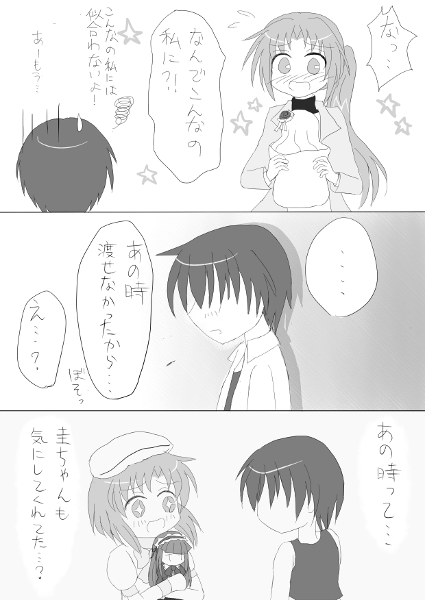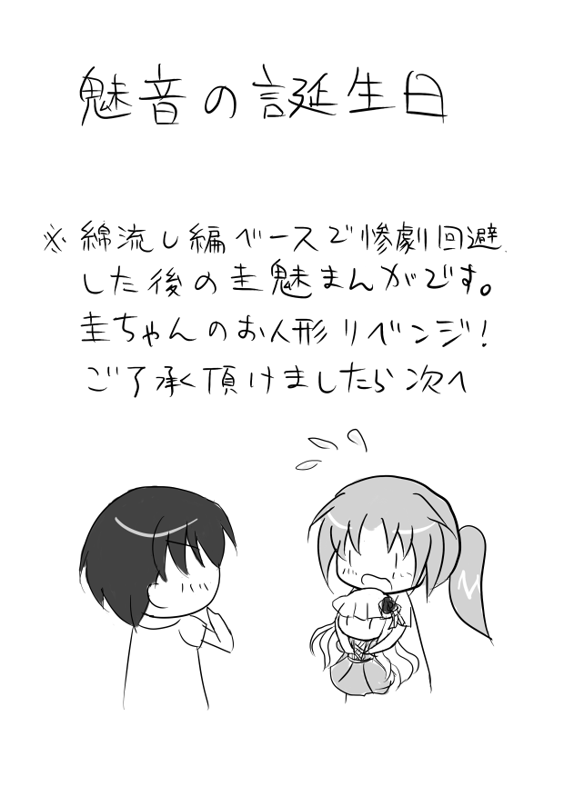 皆殺し編で圭一が魅音に人形を渡したのも感動的で可愛くて良かったですが、やっぱり綿流し編で一度人形を渡せなかった流れを踏まえて再度圭一から人形プレゼントしてあげて欲しいな、という妄想です。